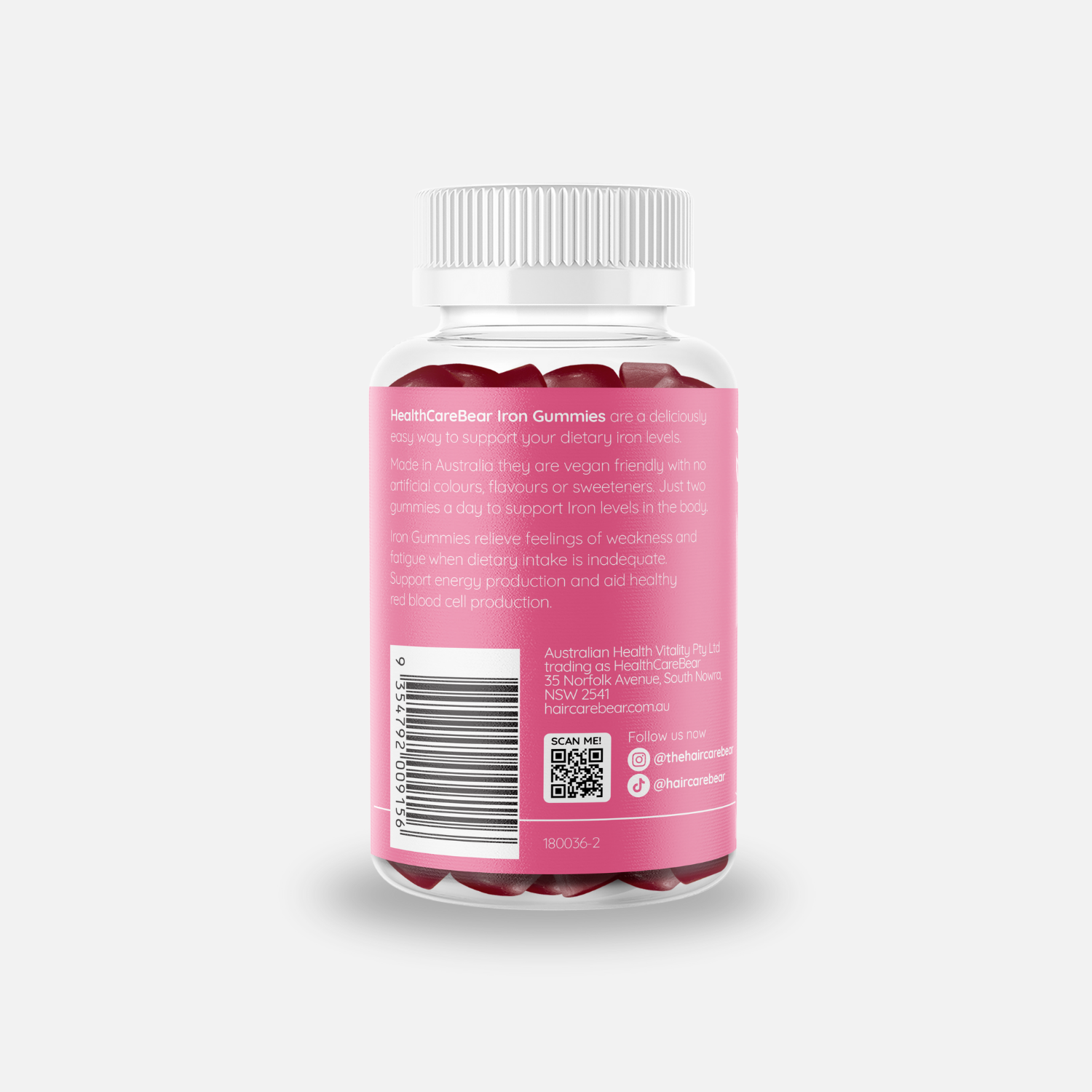 Healthcarebear Iron Gummies contain 24 mg of Iron per serve to relieve tiredness and fatigue when dietary intake is inadequate. Healthcarebear Iron Gummies are made with a pectin base so they are 100% vegetarian friendly and have a softer, chewier texture. With a delicious raspberry lemonade flavour!